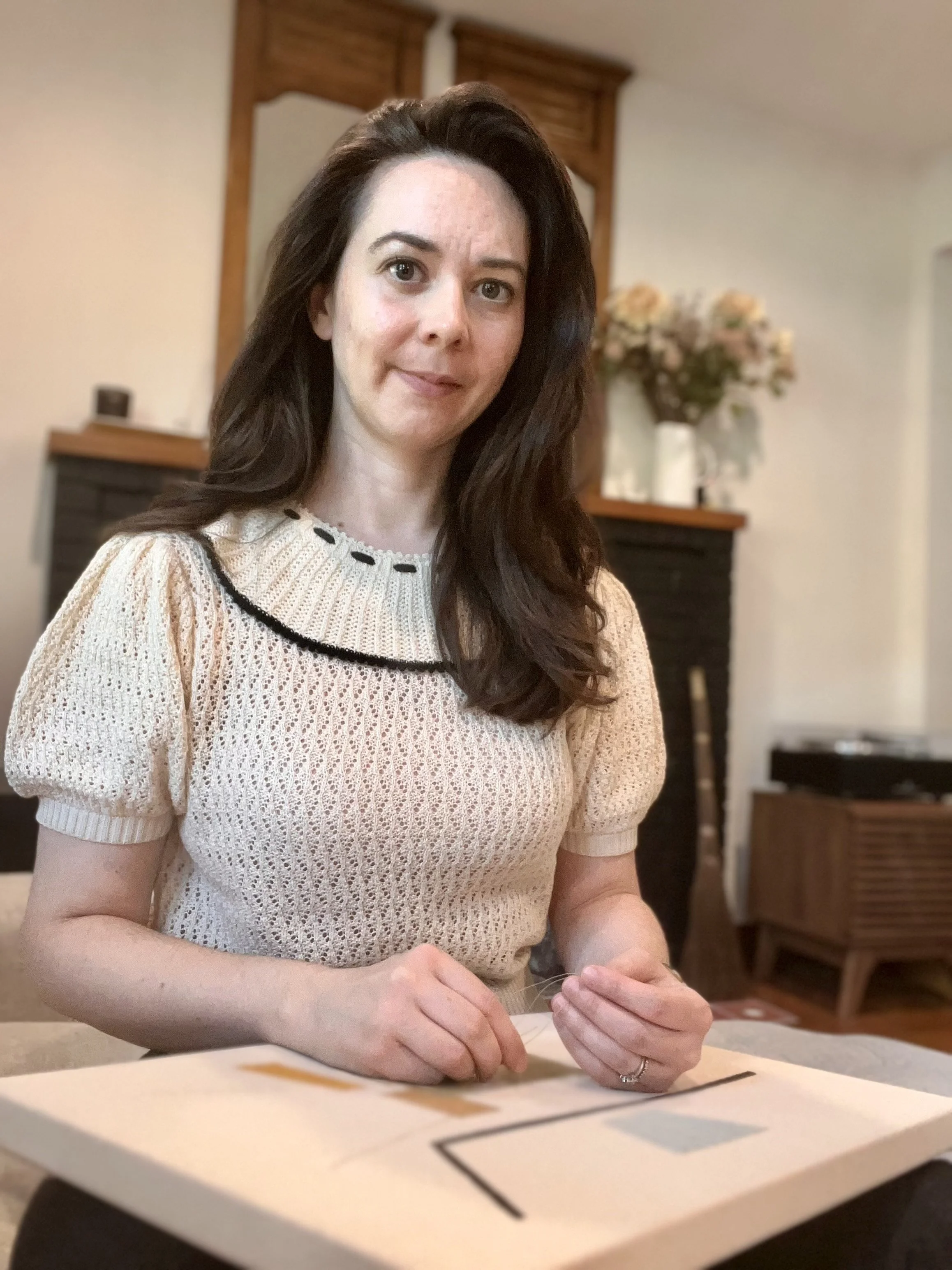 Erin received her Bachelor of Arts in art history from Edinboro University of Pennsylvania and a Master’s of Library and Information Science from the University of Pittsburgh. She has taken classes in embroidery, weaving, and other fine art mediums from the Textile Arts Center, School of the Art Institute of Chicago, and the DuPage Art League. Originally from Pennsylvania and Virginia, Erin lives and works in the suburbs outside of Chicago.